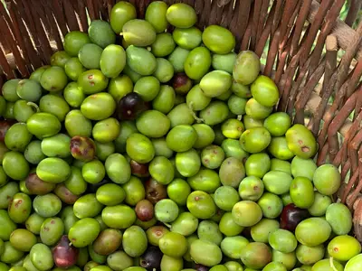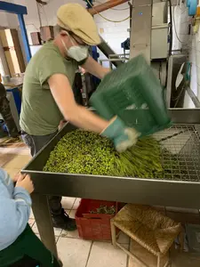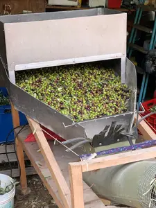 Vor dem Mahlen der Oliven werden sie mit einem Gebläse von Blättern befreit.