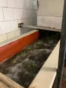 Nun werden die Oliven in der Waschanlage mit Trinkwasser gereinigt. So wird sichergestellt, dass Verunreinigungen, die die Qualität des Produkts während der Verarbeitung beeinträchtigen könnten, entfernt werden.
